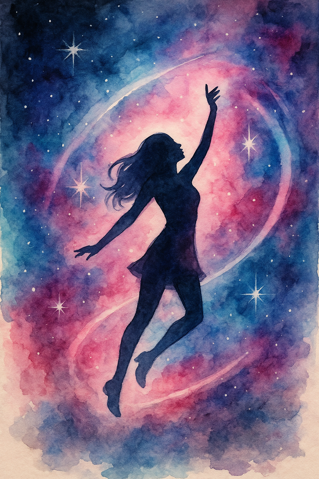 It’s one of those tiny artistic choices that grounds the cosmic imagery in something real — a person having fun, claiming her space, being wholly herself.