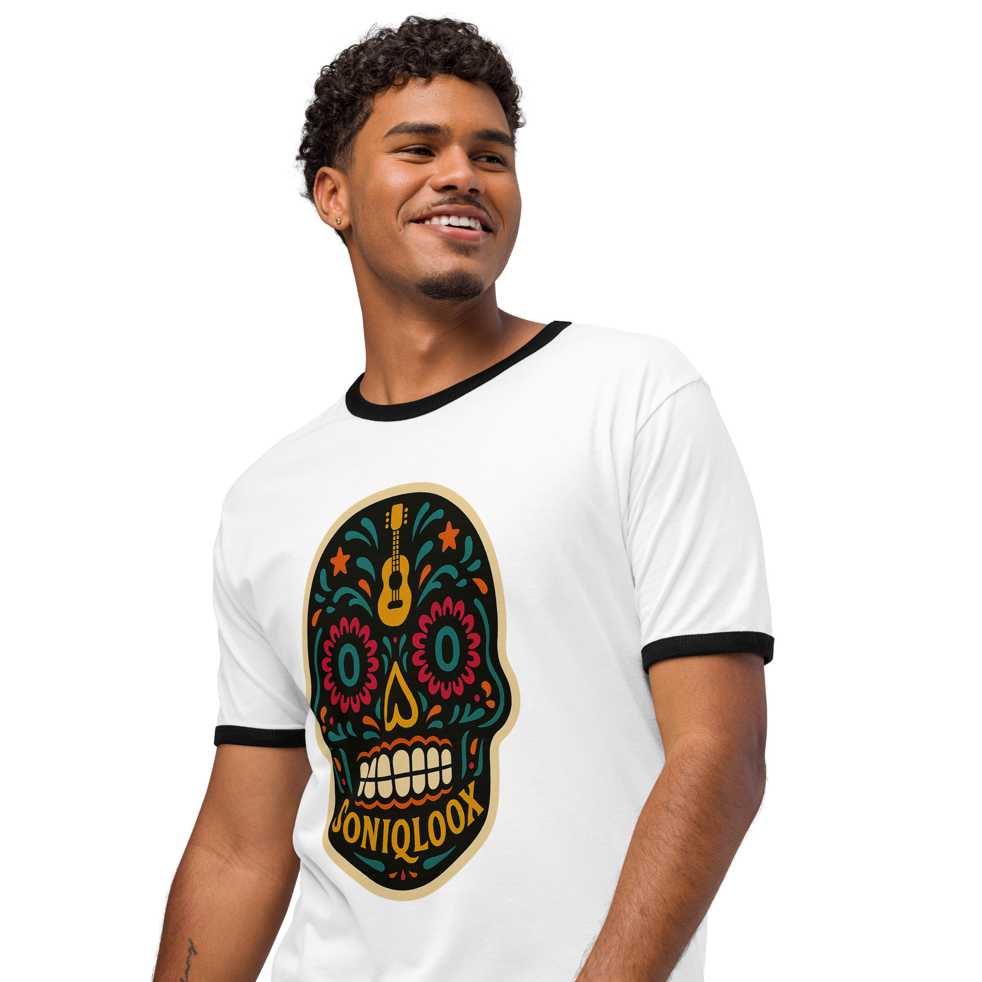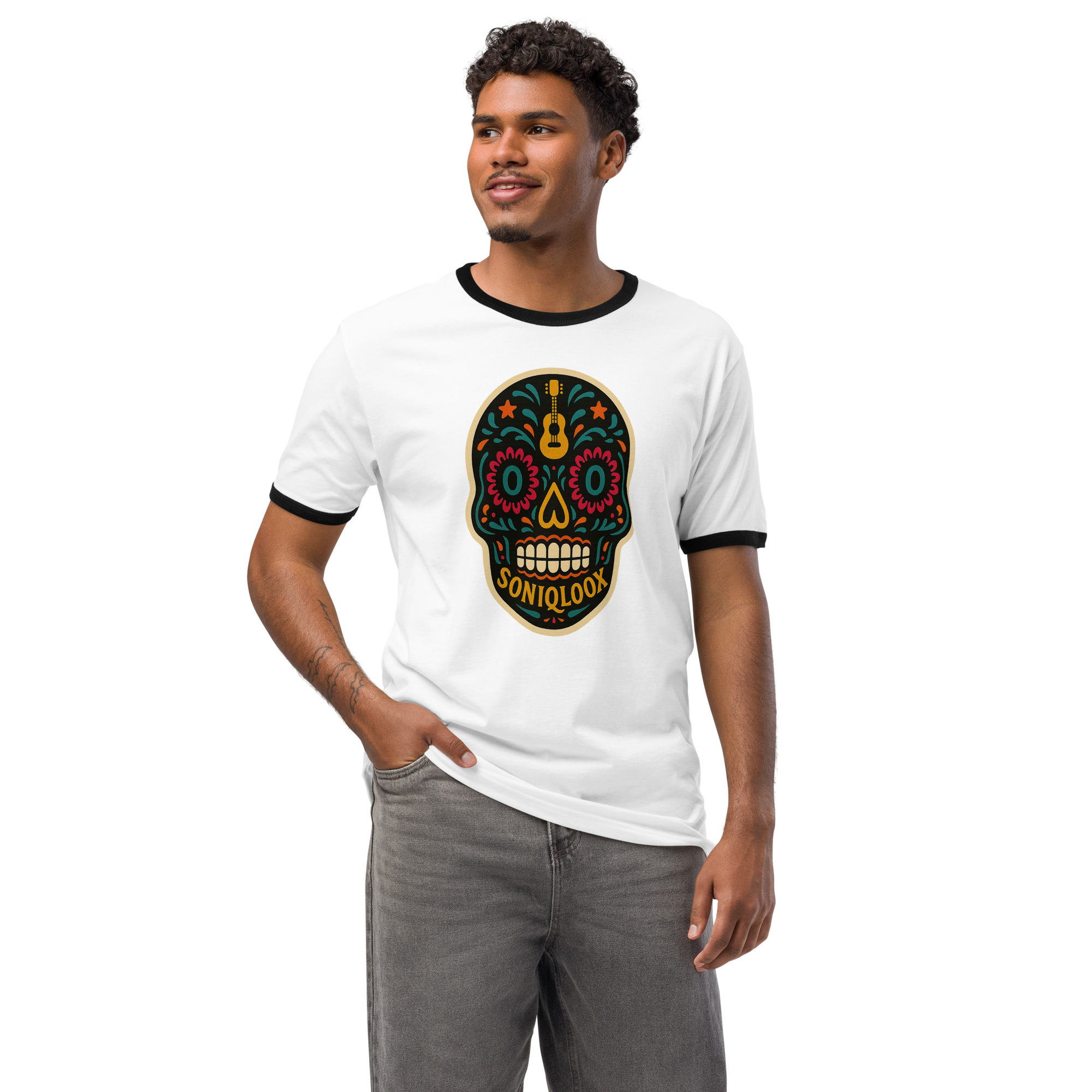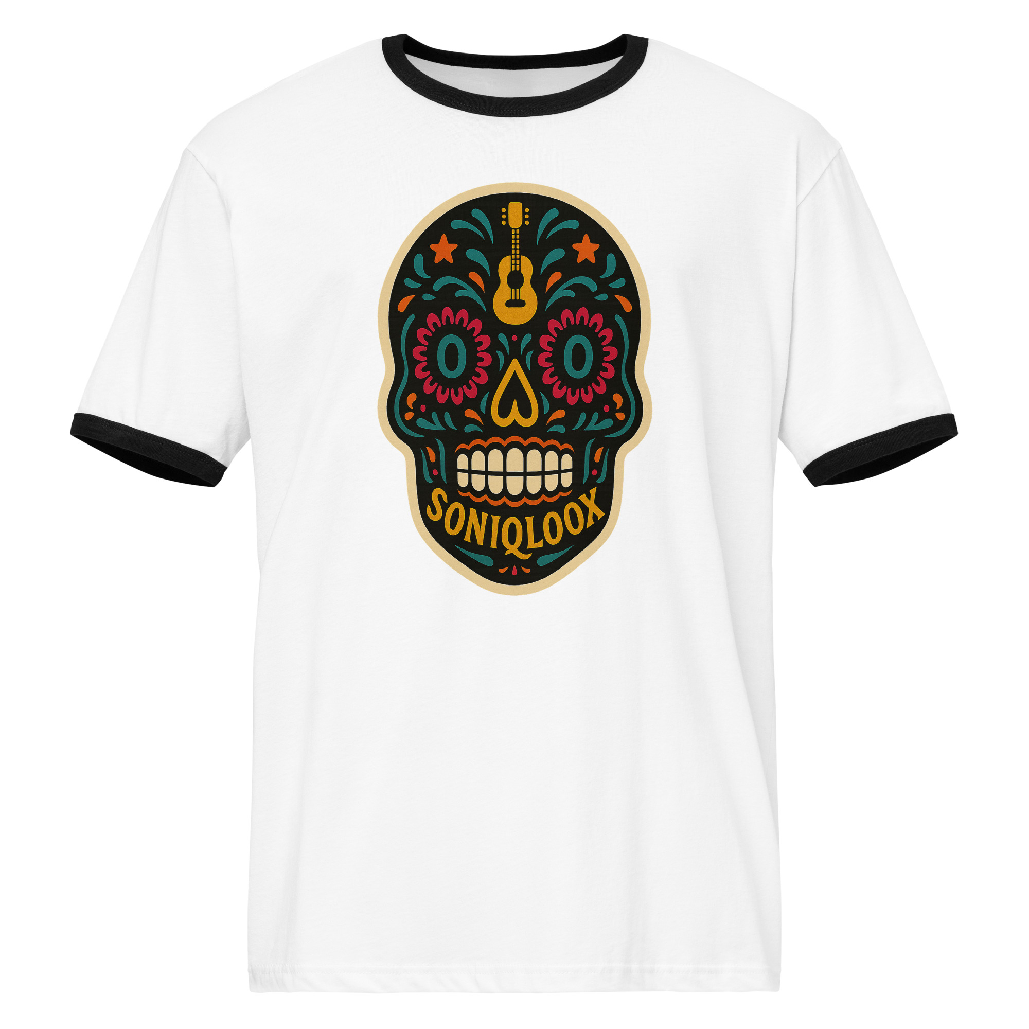 This SONIQLOOX Dia de los Muertos inspired lightweight cotton tee features a relaxed fit and contrast trims that give it a retro look. Wear it with jeans, shorts, or joggers for a laid-back everyday look.• 100% combed ring-spun cotton