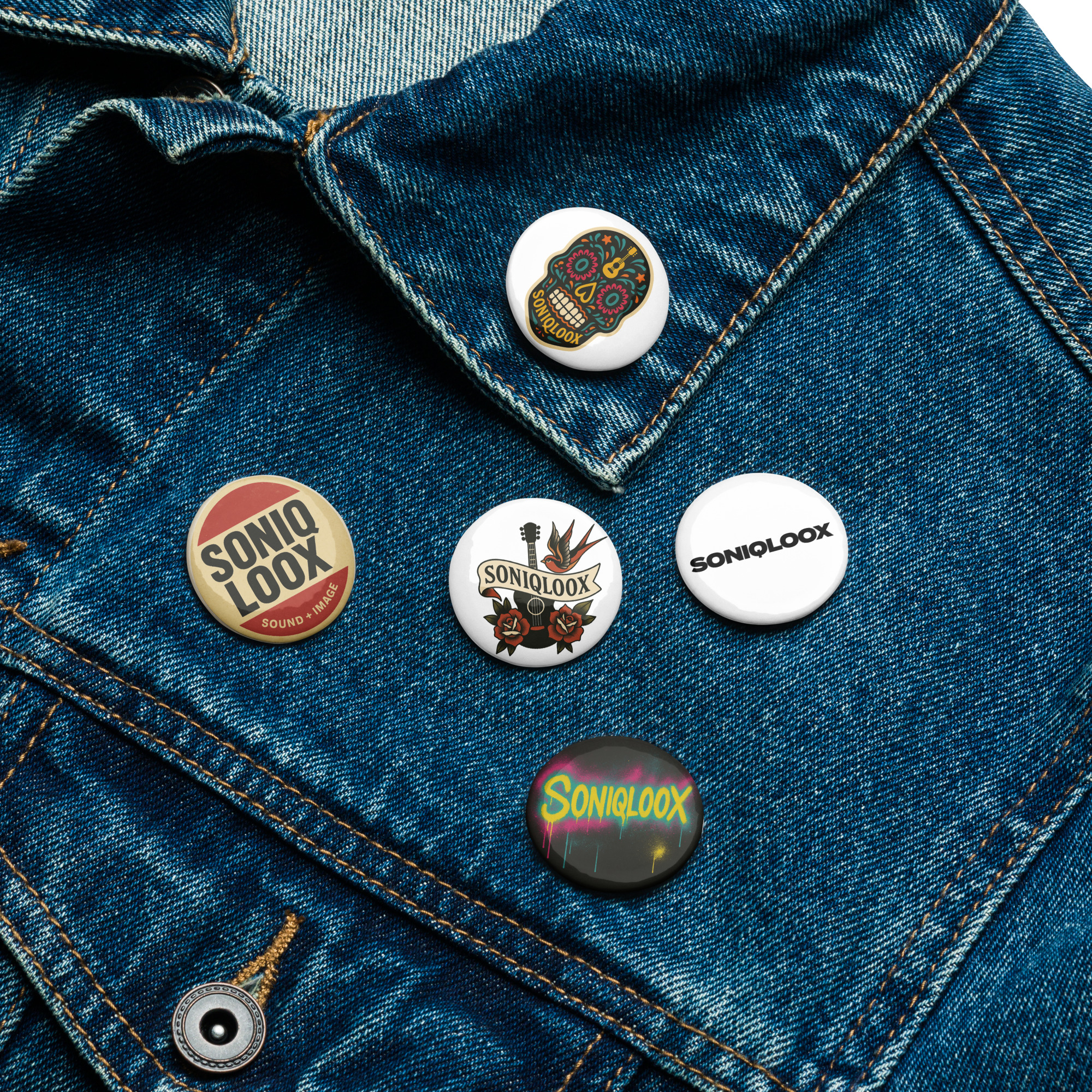 Deck yourself out with SONIQLOOX swag and express yourself in a meaningful way with top-quality pin buttons. They’re lightweight, sturdy, and easy to put on. With a scratch and UV-resistant coating and a glossy finish, these pin buttons are made to last. Show off the things you care about and add a pop of personality to your clothing or accessories with vibrant pin buttons.• They come in a set of 5