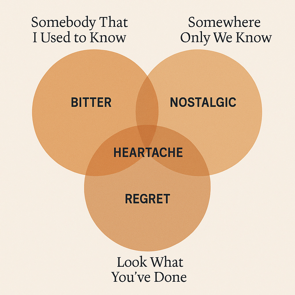 Gotye’s “Somebody That I Used to Know” lives in the cold aftermath, sifting through the wreckage with sharp edges and no apologies. Keane’s “Somewhere Only We Know” lingers in the fragile before, holding tight to something sacred that’s slipping away. Jet’s “Look What You’ve Done” falls somewhere in the middle — reflective and wounded, but warm enough to still let the light in. Together, they form an emotional timeline: before, during, and after the breaking point.